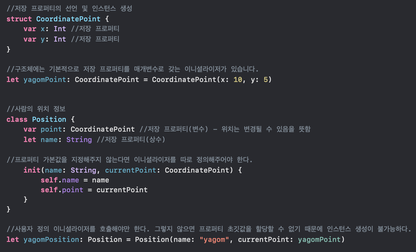 프로퍼티 클래스, 구조체 또는 열거형 등에 관련된 값 저장 프로퍼티 : 인스턴스의 변수 또는 상수 (클래스, 구조체에서만 사용) 연산 프로퍼티 : 값을 저장한 것이 아닌 특정 연산을 실행한 결괏값 (클래스, 구조체, 열거형에서 사용) 타입 프로퍼티 : 특정 타입에 사용 프로퍼티 감시자 : 프로퍼티의 값이 변할 때 변화에 따른 특정 작업을 실행 (저장 프로퍼티에 적용, 부모 클래스로부터 상속 가능) 지연 저장 프로퍼티 필요할 때 값이 할당됨 lazy (지연 저장 프로퍼티) var 키워드를 사용하여 변수로 정의함 (상수(let)는 인스턴스가 완전히 생성되기 전에 초기화해야 하므로 필요할 때 값을 할당하는 지연 저장 프로퍼티와는 맞지 않기 때문에) 복잡한 클래스나 구조체를 구현할 때 많이 사용됨 지연 저장 ..